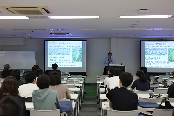 miniオープンキャンパスのスタートを飾ったのは、入試を担当する職員による大学概要・入試制度の説明です。京大の成り立ちから入試制度の詳細までを幅広く紹介。