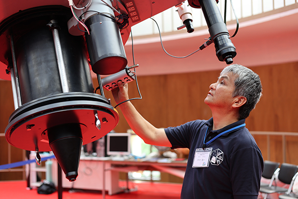 マンホールの蓋と同じくらいの直径65cmのレンズがはめ込まれた望遠鏡は、一般的なものとは桁違いの大きさ。屈折望遠鏡としては、東アジアでもっとも大きいそうですが、世界的には小さいほうなのだとか……。